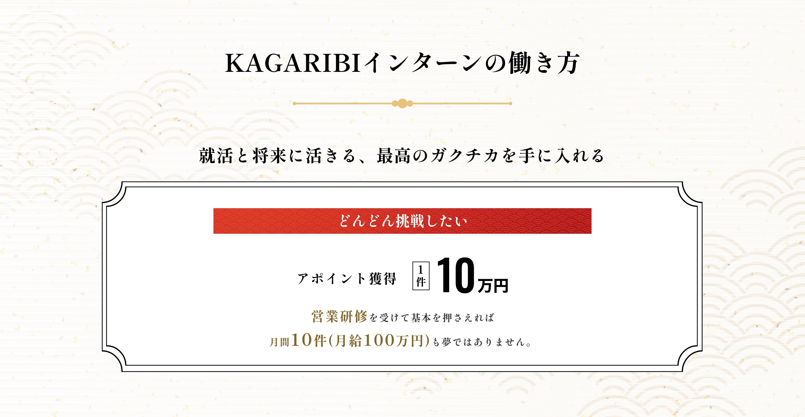 KAGARIBIには確立されたセールスメソッドがあり、一から教育させていただきます。セールススキルを身につけ社会人になって重宝される人材を共に目指しましょう。