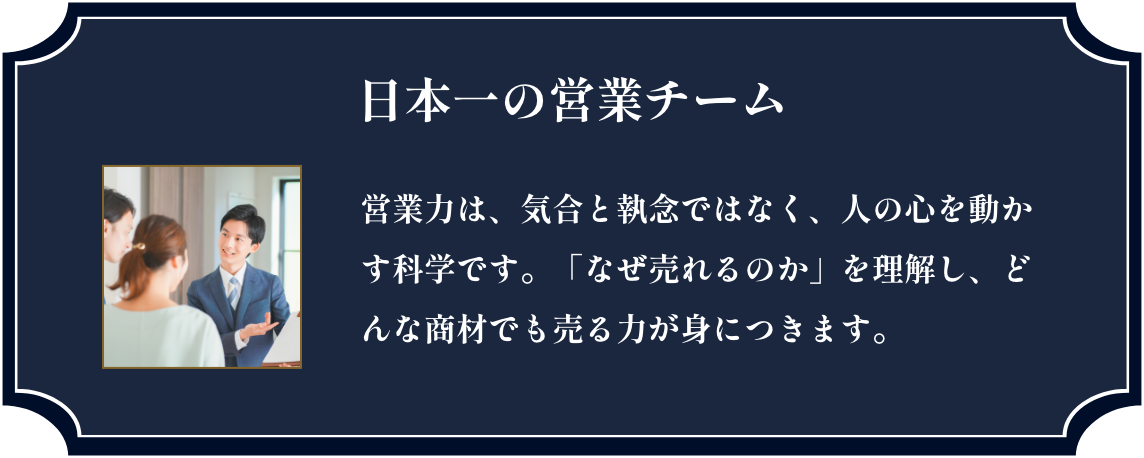目標達成意識から目標必達へ私は、チームの目標の達成に執着心を抱き、チームの利益責任を一身に担い、目標達成のシナリオを創り、部下と共に常に達成の喜びを共有していきます!